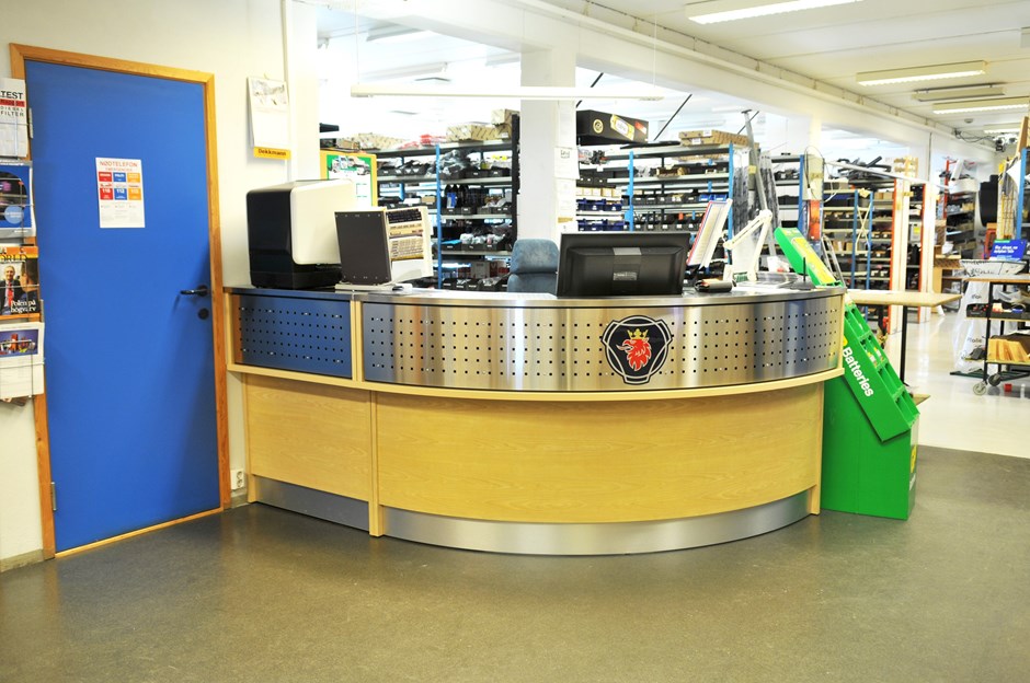 Alstad auto AS - Molde I.nr.: 36444 - Fil: ESC_6769 copy Kundemottak i bilverkted diskplate belagt med rustfritt stål. Øvre front i perforert stål. Forøvrig utført i bjørk. Design:Lium Foto:Johan Martin Lium Kunde:Sunde Interiør AS Forrige Tilbake Neste