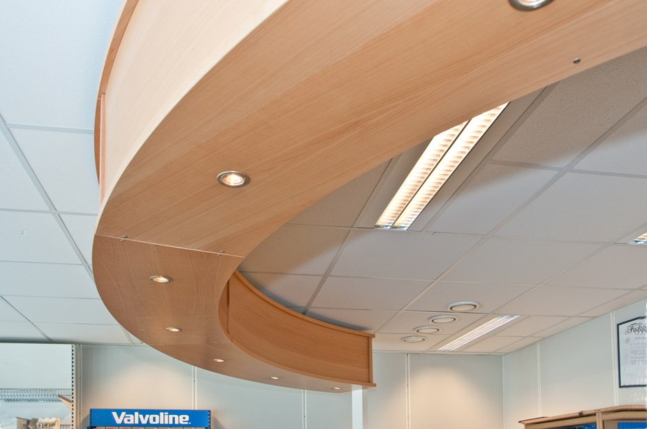 Skranke i kundemottak bilfirma. Komplett med baldakin. Utført i bøk med liggende panel. Perforert bakbelyst stål i øvre frontpanel. Diskplate og arbeidsplate med høytrykkslaminat K-5583UN. Alulaminat M-2022 i sokkel.
