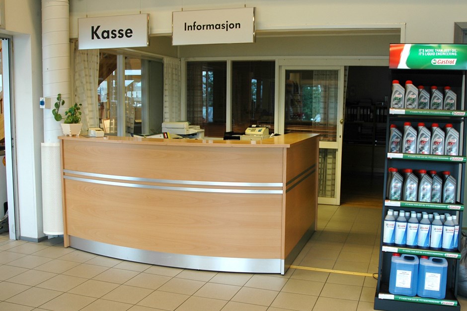 Infoskranke bilverksted. Utført i bøk med dekorstriper i alulaminat. Rusfri sokkellist. Design:kunde/olm Forrige Tilbake Neste