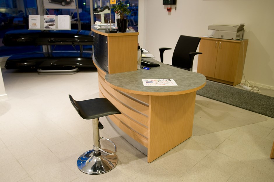 Nord-vest Bil AS - Kristiansund N I.nr.: 33978 - Fil: esc-0464-2 3 like skranker i kundemottak. Buet front med besøksplate på en side. Liggende front med striper av alulaminat M-2022 sokkel. Bakbelyst perforert rustfritt stål i øvre front. Bordplate belagt med laminat K-5818. Design:Lium Foto:Johan Martin Lium Kunde:Per Solem AS Forrige Tilbake Neste