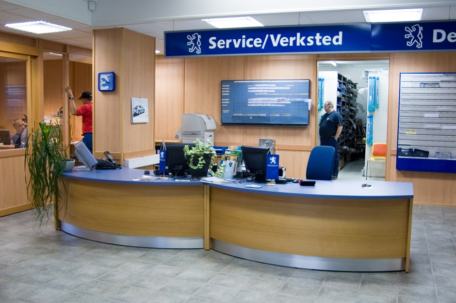 Prøven Bil AS - Verdal I.nr.: 30677 - Fil: _DSC9103_edited-1 Tre skanker i kundemottak utført i eik finer og høytrykkslaminat PP-5687UN på arbeidsplater og avlastningsplater. Avlasningplate med reoler under. Sokkel i M-2022. Design:Lium Foto:Johan Martin Lium Kunde:Kontordesign AS Forrige Tilbake Neste