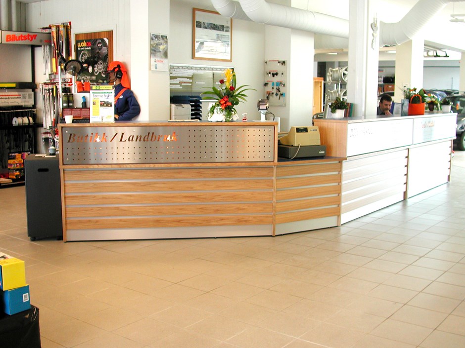 Syrstadeng bil AS - Storås I.nr.: 27915 - Fil: DSCN7202 Skranke i eik med plastlaminat PP-1394 i diskplater og arbeidsplater. Liggende nedre frontpanel med rustfritt stål i fuger og sokkel. Perforeret øvre front med bakbelysning og innlagt tekstfelt. Design:Lium Foto:Johan Martin Lium Kunde:Kontorplan AS Forrige Tilbake Neste