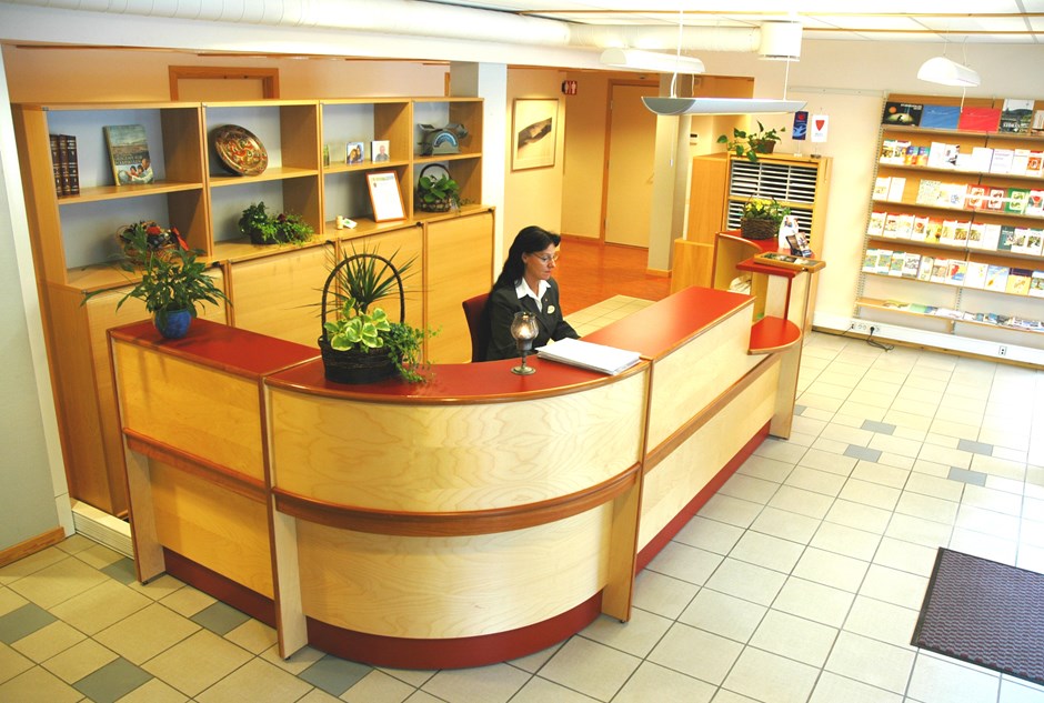 Servicetorg Meldal kommune. Skranke i bjørk finer med kirsebær kantlister. Plastlaminat på sokkel Design:OLM Forrige Tilbake Neste