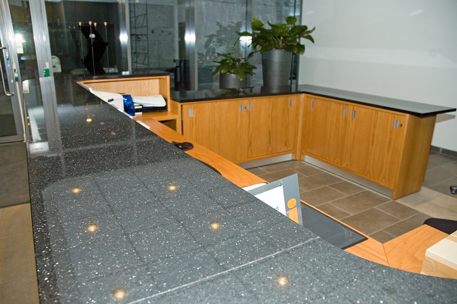Resepsjonsskranke. Skranke i eik med diskplate og front i stein. Design:Helene Ystgaard Forrige Tilbake Neste