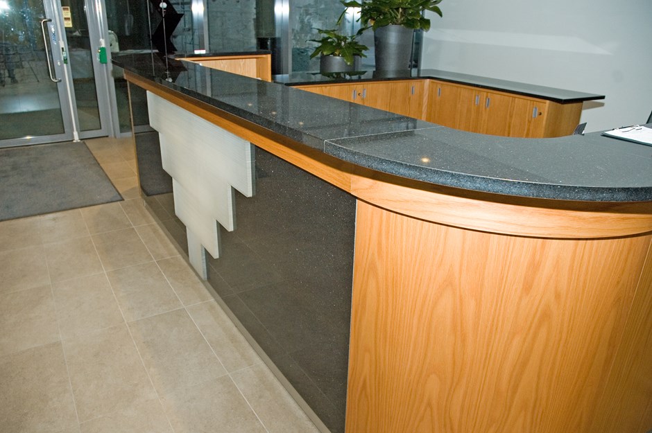 Resepsjonsskranke. Skranke i eik med diskplate og front i stein. Lexan med bakbelysning. Design:Helene Ystgaard Forrige Tilbake Neste