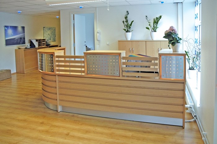 Kundemottak med nedfelt PC-skjerm i skranketopp. Utført i bøk med liggende panel og alulaminat M-2022 på sokkel.