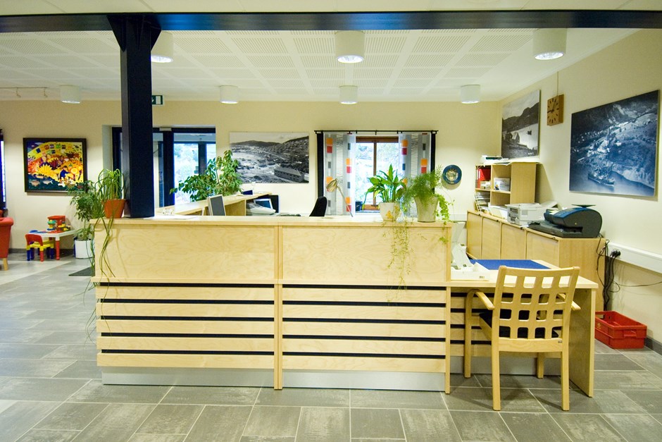 Resepsjon kundemottak servicekontor. Hjørneskranke med liggende panel i bjørk. Stripene mellom de liggende panelene i bjørk er lakkert i farge NCS 6825 R76B. Sokkel i alulaminat M-2022. Utsparing for søyle gjennom diskplata og arbeidsplata.