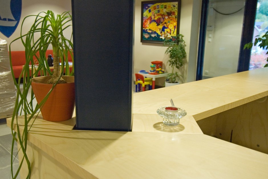 Resepsjon kundemottak servicekontor. Hjørneskranke med liggende panel i bjørk. Stripene mellom de liggende panelene i bjørk er lakkert i farge NCS 6825 R76B. Sokkel i alulaminat M-2022. Utsparing for søyle gjennom diskplata og arbeidsplata.