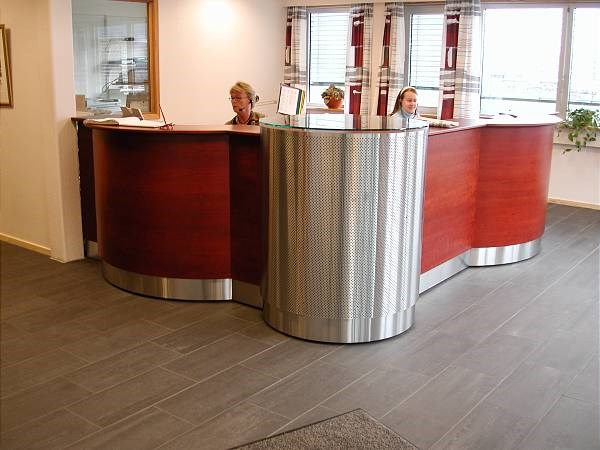 Resepsjonsskranke. Perforert stålsylinder i hjørnet. Permkarusell inne i sylinder. Design:Helene Hansen Ystgaard - Arkipel Interiørdesign AS. Forrige Tilbake Neste