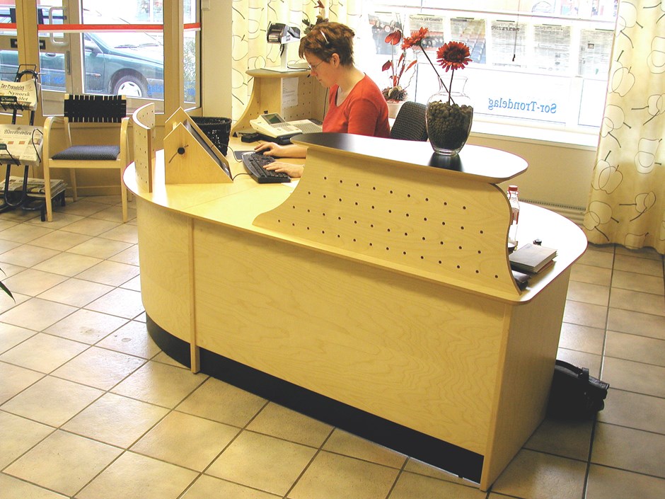 Resepsjonsskranke. Liten "nett" skranke i bjørk med perforert øvre front. Nedsenket flatskjerm med egen avskjerming. Diskplate i mørk laminat. Forrige Tilbake Neste