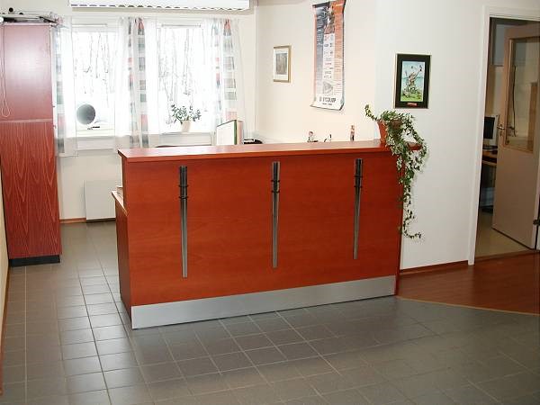 Resepsjonsskranke. Resepsjonsskranke med dekorelementer på front i rustfritt stål. Design:Helen Ystgård - Arkipel Interiørdesign AS Forrige Tilbake Neste