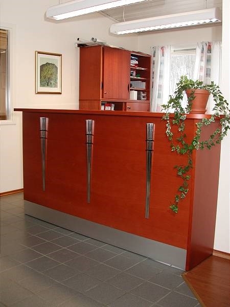 Resepsjonsskranke. Resepsjonsskranke med dekorelementer på front i rustfritt stål. Design:Helen Ystgård - Arkipel Interiørdesign AS Forrige Tilbake Neste