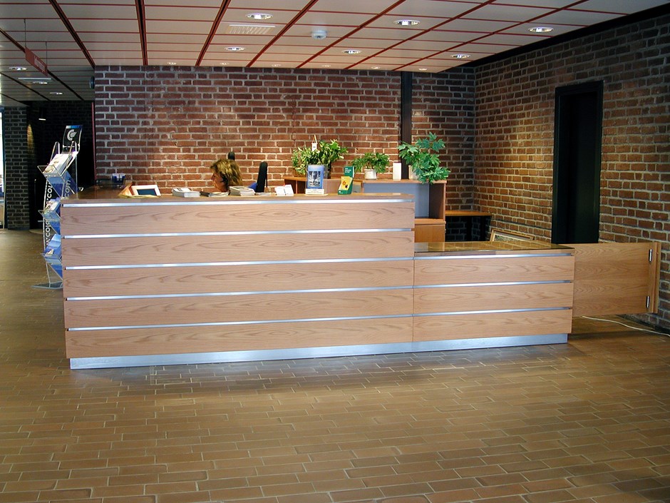 Resepsjonsskranke i Rådhus. Skranke i beisa ek. Liggende frontpanel med alufarget laminat i fjær og sokkel. Forrige Tilbake Neste