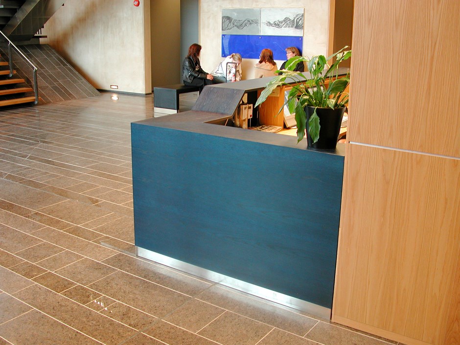 Tronsø Tinghus - Resepsjonsskranke. Skranke utført i beisa ek. Sjalusidører med lås foran PC-skjerm . Design:Astrid Nordmark Dahl - Bergersen Arkitekter AS Forrige Tilbake Neste