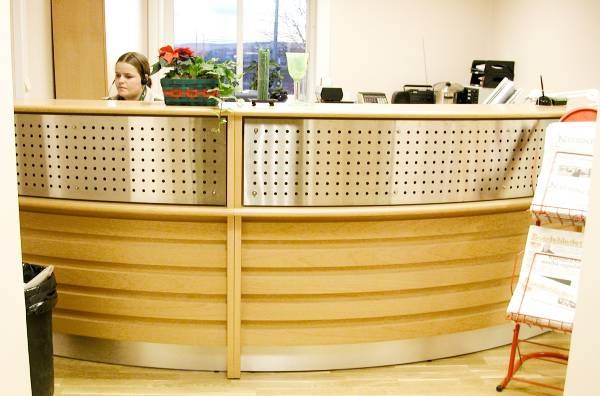 Resepsjonsskranke Øvre front med bakbelyst perforert rustfritt stål. Nedre front med liggende panel. Forrige Tilbake Neste
