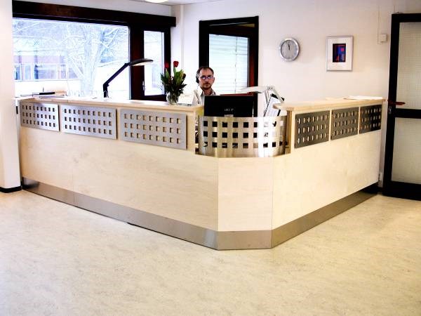 Resepsjonsskranke i bjørk. Perforert øvre front i stål.