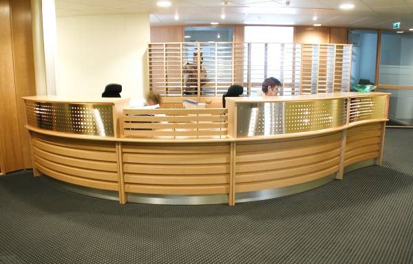 Resepsjonsskranke Øvre front med bakbelyst perforert rustfritt stål. Nedre front med liggende panel. Forrige Tilbake Neste