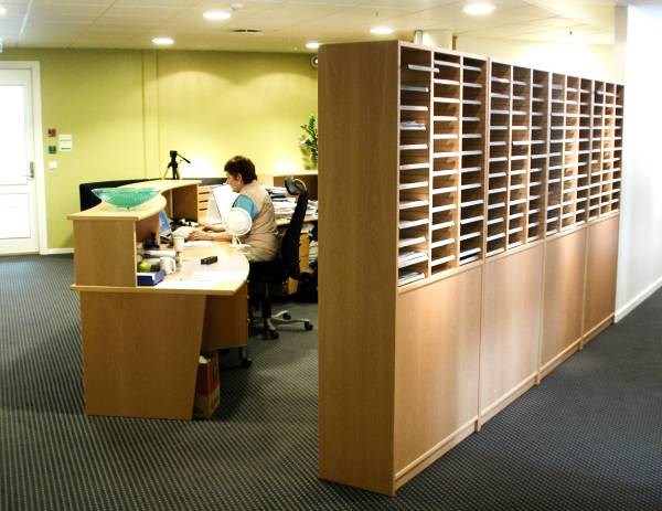 Resepsjonsskranke med postreol som romdeler Øvre front med bakbelyst perforert rustfritt stål. Nedre front med liggende panel. Forrige Tilbake Neste