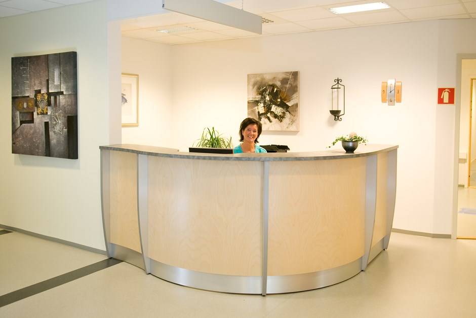 37233 - 5386 Resepsjon Hjørneskranke i bjørk. diskplater utført i laminat K-5818. Arbeidsplate i bjørk finer, og sidevanger og sokkellist i høytrykkslaminat M-2022. Design:Kunde/OLM Forrige Tilbake Neste