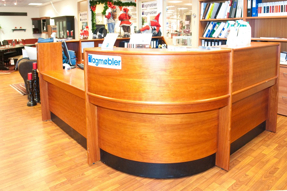 Skranke for kundemottak i butikk. Kirsbærbeis på front og plater med svart sokkel.
