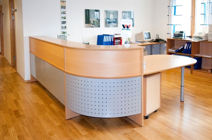 33080 - 3651 Resepsjon Rettskranke med 90` hjørne. Diskplate og øvre front i bøk. Nedre front i perforert grålakkert stål. Design:Kunde/OLM Forrige Tilbake Neste