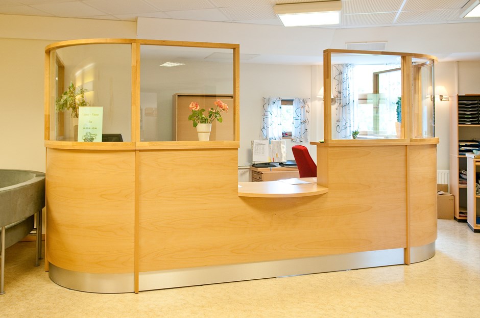 Romolslia Helsestasjon I.nr.: 36960 - Fil: esc_7423-copy Buet skranke i klarlakkert bøk produsert i U-form med glassoverbygg bøk finer som er klarlakkert. Nedsenket parti i midten for universell utforming. Sokler i høytrykkslaminat M-2022. Design:Kunde/Lium Foto:Johan Martin Lium Kunde:Kinnarps AS Forrige Tilbake Neste