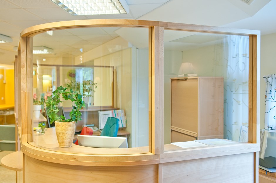 Romolslia Helsestasjon I.nr.: 36960 - Fil: esc_7431-copy Skranke i bøk produsert i U-form med glassoverbygg. Sokler i høytrykkslaminat M-2022. Design:Kunde/Lium Foto:Johan Martin Lium Kunde:Kinnarps AS Forrige Tilbake Neste