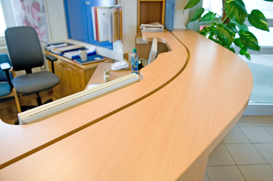 Innlandet Sykehus - Reinsvoll I.nr.: 34781 - Fil: ESC_0759 copy Buet skranke i bøk tilpasset eksisterende metallgitter i nisje mellom to vegger. Hev/senk på arbeidsplata. To skjermnedsinker med usparing i diskplata for dataskjerm. Sokkel med alulaminat M-2022. Design:Lium Foto:Johan Martin Lium Kunde:Senab Eikeland AS Forrige Tilbake Neste