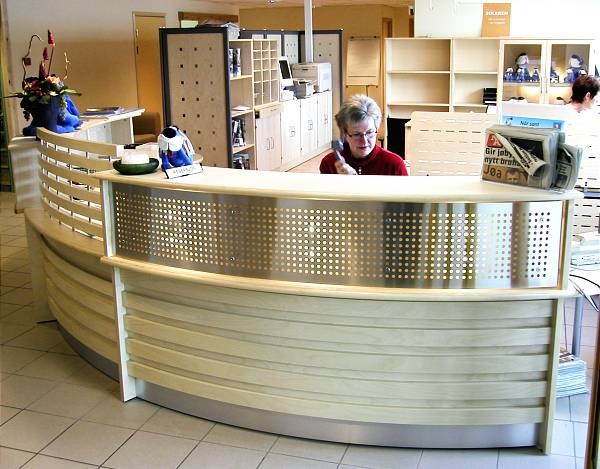 Resepsjonsskranke. Øvre front i perforert stål. Midtseksjon med dekorlister i bjørk. Nedre front i bjørk med utenpåliggende dekorlister i bjørk. Forrige Tilbake Neste