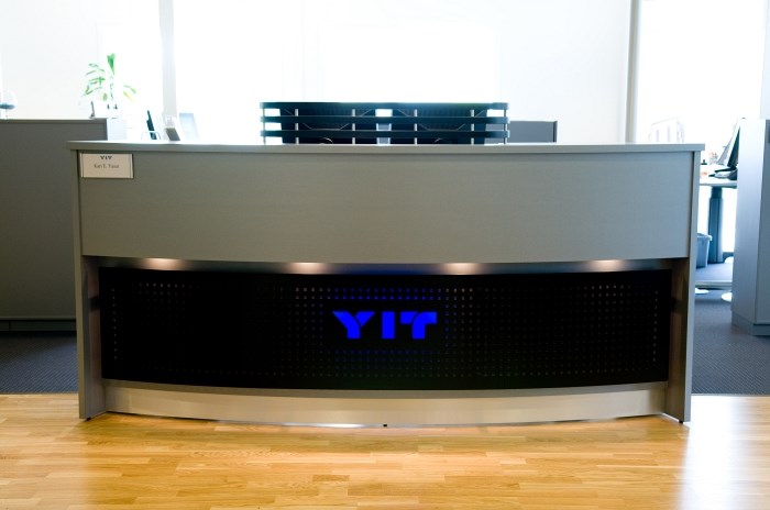 34881 - 4460 Resepsjon Resepsjonsskranke utført i laminat F-0562 Nedre front i perforert svartlakkert stål med laserskåret logo med bakbelysning av ledlamper. Downlight under diskplate. Sokkellist i alu-laminat M-2022 Design:Kunde/OLM Forrige Tilbake Neste