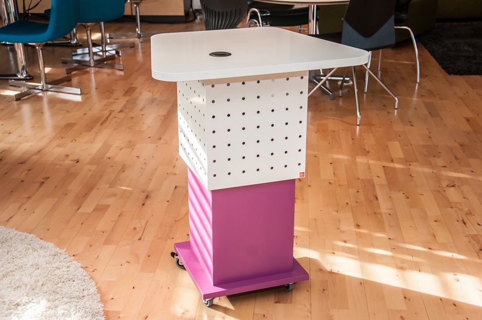 7444 Talerstol Søyleformet talerstol med el hev/senk som veier kun 35kg. Avbildet med plate i hvit høyglans laminat K-1040 AR og perforert stål hvitlakkert i øvre front. Nedre del belagt med Formica F-6907. Dør på baksida og låsbare hjul. Design:OLM Forrige Tilbake Neste
