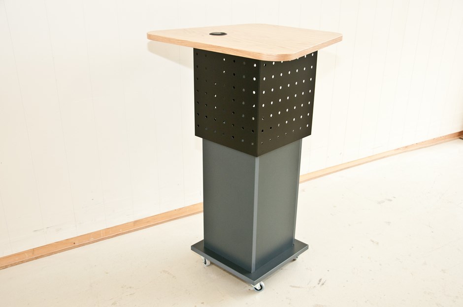 Søyleformet talerstol med el hev/senk som veier kun 35kg. Avbildet med plate i eik og perforert stål svartlakkert i øvre front. Nedre del belagt med Formica F-2297 Terril. Dør på baksida og låsbare hjul.