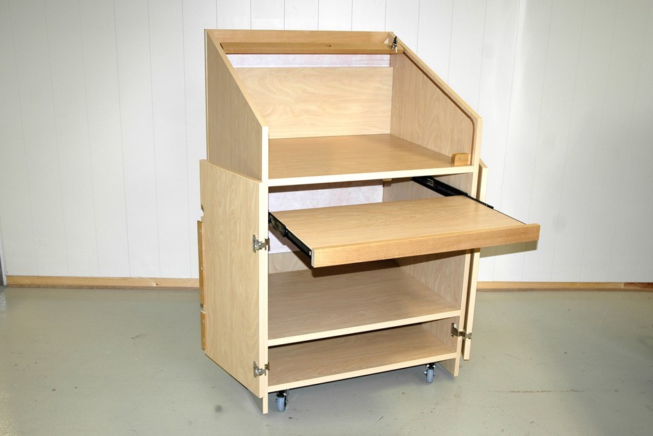 32515 talerstol Talerstol med låsbart sjalusi på toppdelen. Uttrekkbar tastaturhylle. Hjul. Design:Kunde/OLM Forrige Tilbake Neste