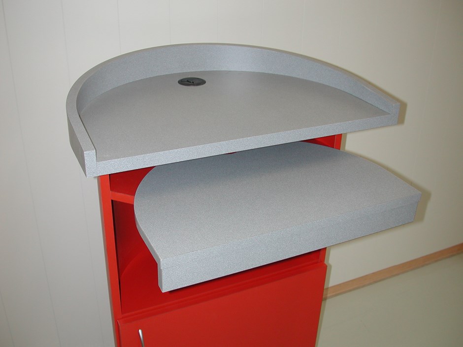 33286 Talerstol/"kundeøy" med tastaturhylle. Overflatebelegg: Høytrykkslaminat. Grå:F-7508 Rød:F-6902 Farge etter ønske. Forrige Tilbake Neste