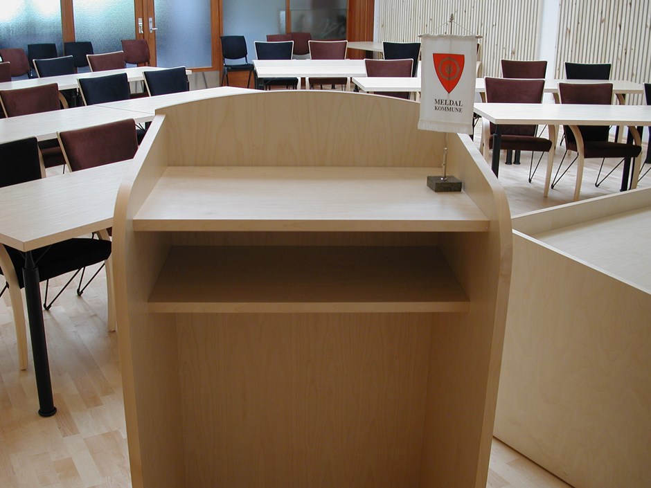 27747 - 1289 Talerstol i bjørk. Kommunestyresal. Enkel men grei talerstol utført i bjørk. Plate en hylle. Design:OLM Forrige Tilbake Neste