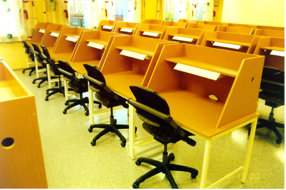 00134 Studentleseplass. Liten plass som kan omgjøres til eksamensbord. Toppene er avtagbar og kan settes ned på understellet som da opptrer som "frontpanel". OBS: Smart el-tilkobling - rekken kobles sammen mot en kontakt i veggen. Design:OLM Filter Lesesal Forrige Tilbake Neste