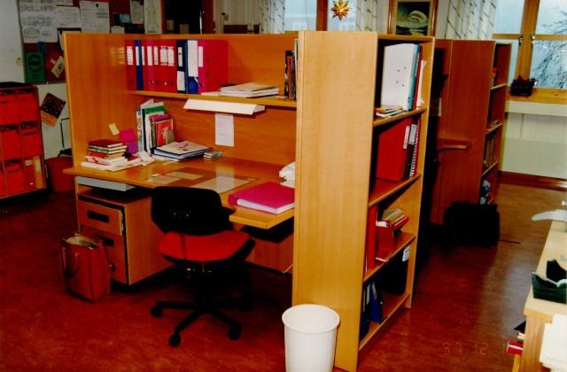 Kontorplass for lærer. Romslig plass med mulighet for reole som passer på enden av arbeidsplassen. Kan leveres med arbeidslys og kontakt for PC. Design:OLM Forrige Tilbake Neste