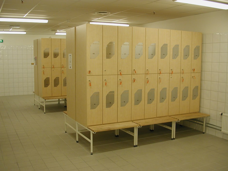 Garderobeskap for treningssenter. Utførelse i melaminbelagt plate. Dørskilt med laserfrest logo. Hvitlakkert stålunderstell. Sitteplate av heltre lekter. Design:OLM/kunde. Forrige Tilbake Neste