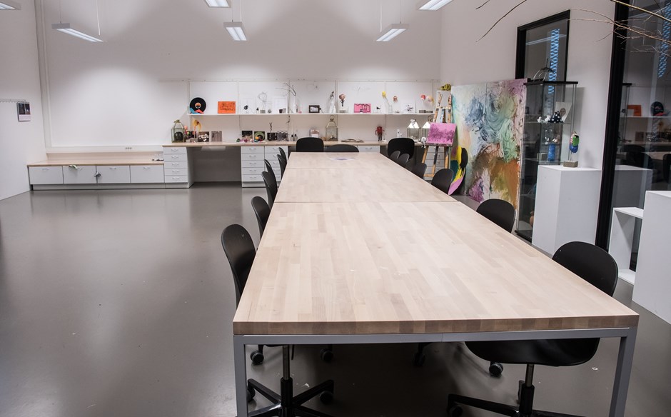 Det ble levert et solid to-delt arbeidsbord med bordplate i bjørk limtre. Understell «skreddersydd» av firkantrør med svingbare låsbare hjul.