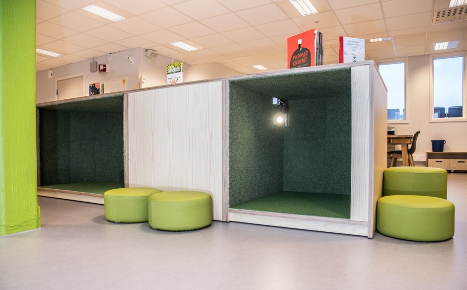 Kulturtribunen Trondheim I.nr.: 52274 - Fil: bilde-4-dsc_6404-copy Lesehulene er belagt med teppefliser med 2 forskjellige lengder og farger. Alle lesehulene har montert leselys Seed fra Northern Lighting. Design:tegn_3 Foto:Johan Martin Lium Kunde:Fagerhaug & Olstad AS Forrige Tilbake Neste