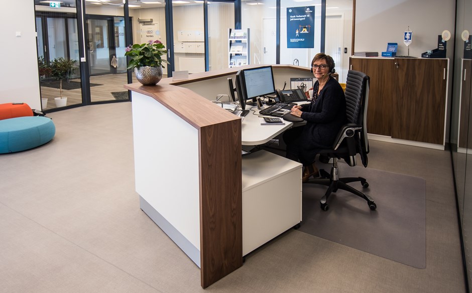 Gjensidige Orkla Orkanger I.nr.: 51902 - Fil: bilde-2-dsc_6209-copy-3 Skranken har U-form med sideseksjoner der diskplata skrår nedover. Det gir en «lettere» skranke. I seksjonene på sida er det lagt inn hyller. Arbeidsplata har hev/senk understell. Design:Kunde/Lium Foto:Johan Martin Lium Kunde:Kontorplan AS Filter Hev/senk, Logoer Forrige Tilbake Neste