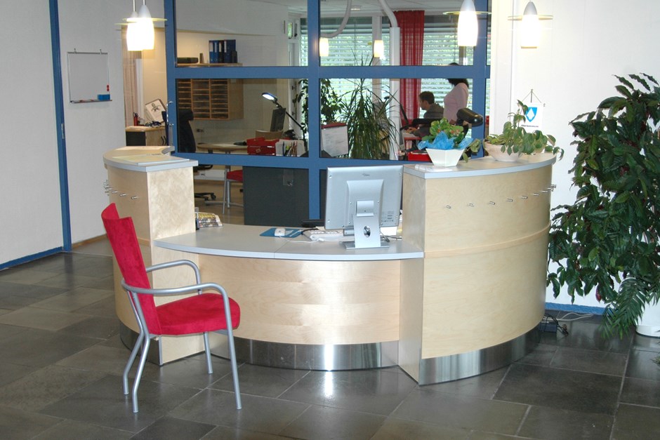 27133 Skranke servicekontor. Bjørk finer - laminat plater og rustfritt stål i sokkel. Dekorpinner i rustfritt stål på øvre front. Midtdel uten topp for kundebehandling/rullestolbruker. Design:Kunde/OLM Forrige Tilbake Neste