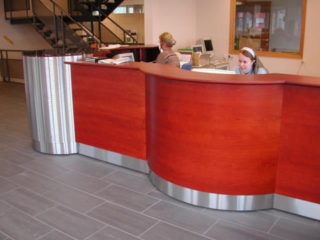 Resepsjonsskranke Skranken er utført i beisa bøk. "Sylinder" i hjørnet er belagt med perforert stål - på baksida er det permkarusell. På toppen av sylinder er det en glassplate. Design:Helene Hansen Ystgaard - Arkipel Interiørdesign AS Forrige Tilbake Neste